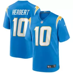The Nike Los Angeles Chargers Justin Herbert #10 Game Jersey is the perfect way to cheer your team and favorite player onto victory this season. Made from polyester material, this Justin Herbert Jersey is incredibly durable and machine washable, while the side mesh panels help promote better ventilation for greater comfort. This Justin Herbert Jersey features a stitched NFL shield and woven jock tag for authenticity as well as screen-printed name, numbers, and logos for a lightweight feel.