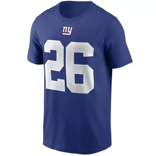 Show everyone who you root for with the Nike New York Giants Saquon Barkley #26 Name & Number T-Shirt. Featuring New York Giants graphics and colors, you’ll be ready to cheer your favorite NFL team to victory. Whether you’re heading to the game or just want to show off your favorite team, this New York Giants top will leave no doubt where your loyalty lies. Wear your team’s colors and show off your pride with the Nike New York Giants Saquon Barkley #26 Name & Number T-Shirt.