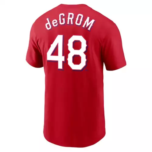 Show everyone who you root for with the Nike Texas Rangers Jacob deGrom #48 Name & Number T-Shirt. Featuring Texas Rangers graphics and colors, you’ll be ready to cheer your favorite MLB team to victory. Whether you’re heading to the game or just want to show off your favorite team, this Texas Rangers top will leave no doubt where your loyalty lies. Wear your team’s colors and show off your pride with the Nike Texas Rangers Jacob deGrom #48 Name & Number T-Shirt.