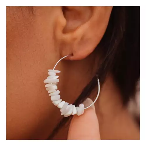 Shimmer like the star you are in our Mother of Pearl Chip Hoop Earrings. This silver open-hoop style features a strand of Mother of Pearl shell chips that are 100% natural and totally genuine (so no two pairs look alike!).